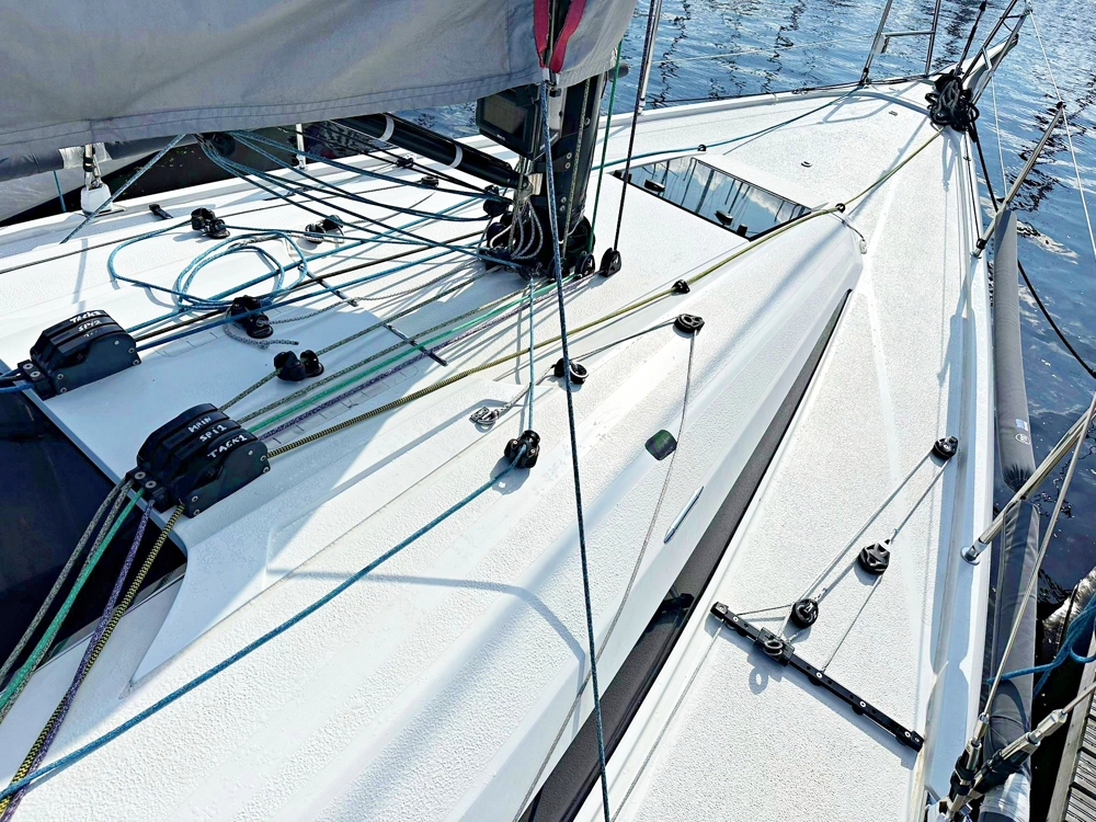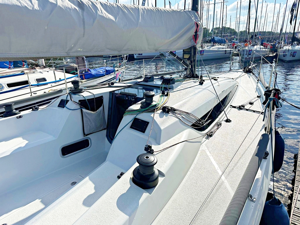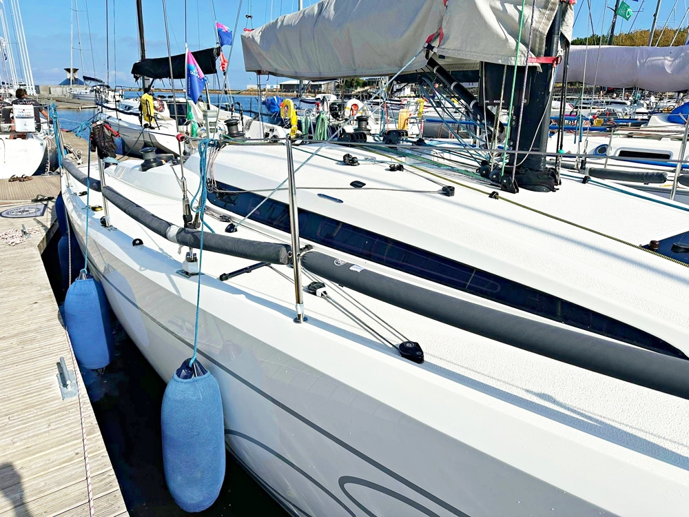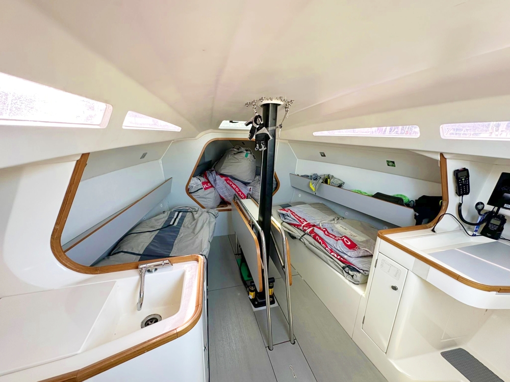 2 Kabinen, 1 Badezimmer, Dinette mit Kartentisch und Gerste. Voll ausgestattete B&G H5000 Instrumentierung mit Mastrepetitoren. Webasto Heizung. Kohlenstoffboom, Kohlenstoffmast mit neuen 2024 PBO Deckbändern und Wald, neue 2024 Textilrückhaltung mit magischem Rad, neue 2025 Tuff Luff und Kohlenspinnstoffpol. Neue 2024 Dyneema® Bögen und Halyards, High-Grip Harken Performa Winden. Karbon-Kupfer. CNC-gefertigte Bleilampe und Fin. Neue 2024 Carbon Schleifmittel. Polli Yacht Design optimierte die Finne und Ruder in 2024.