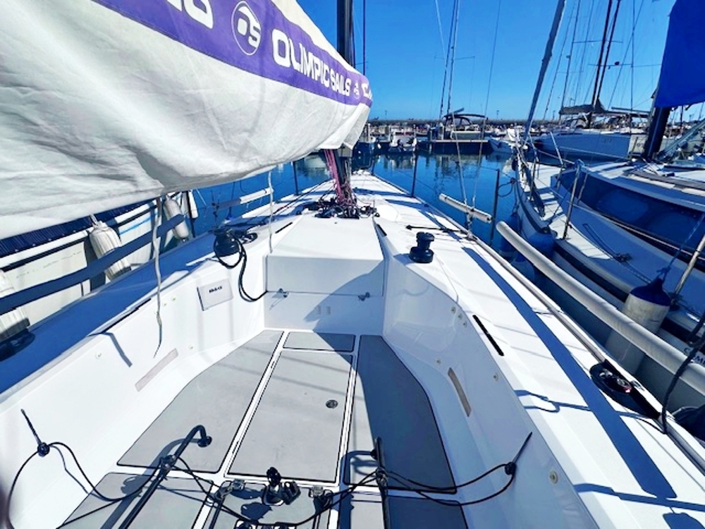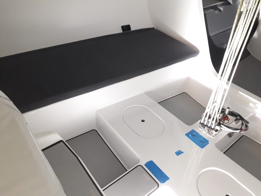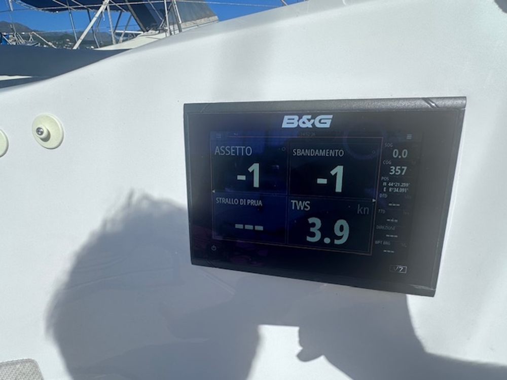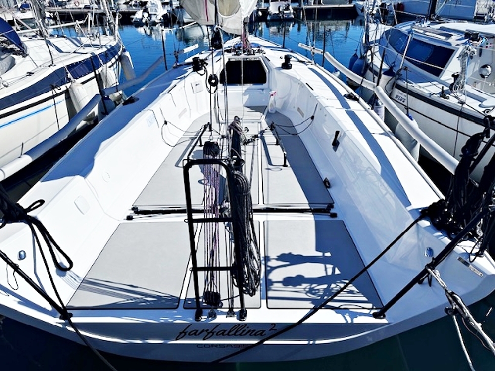 4 Liegeplätze. Manuelle Toilette. Pauger Karbonmast mit Doppelzylindermastbuchse. Pauger Carbon Boom. Pauger Carbon Vang. Rodrigging. Hochfeste Kaskadenrückhaltevorrichtung. Pauger Carbon bowsprit. Gennaker rigging. Smart Tune Blattkontrolle mit Wi-Fi-Transponder zum Anzeigen von Daten auf B&G-Instrumenten, Smartphones oder Tablets. Cunningham System zur Steuerung der Jib-Luff-Spannung. Karbon-Kupfer. B&G Hercules 5000 Instrumentierung mit zwei Mastrepetitoren. Im Cockpit: Vulkan 7R für Charts und andere Renndaten. B&G VHF. B&G Wi-Fi Router. Batterien: 55Ah AGM für Instrumente, Navigationsleuchten und Services. Batterien: 55Ah AGM für Motor. Elektrische Bilgepumpe. Elektrische Pumpe zum Trocknen des Motorraums. Lopolight Navigationslicht (niedriger Verbrauch). Haupt-Elektro-Panel über Bluetooth von einem iPhone gesteuert. Aufbewahrungstaschen im Cockpit und innen. Innenkissen. Zugmesser. Doppeldeckel zum Schließen des Bootseingangs bei schlechtem Wetter (hart und weich). Toilettenhalter. Verschiedene Ausrüstung für Langstreckenrennen. Raptor Cockpitkissen. Ubi Bürgermeisterdeckbeschläge. PBO Forestay mit Aero Tuff Luff.
