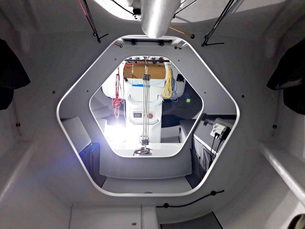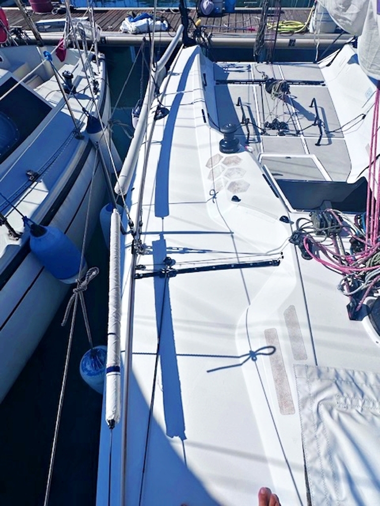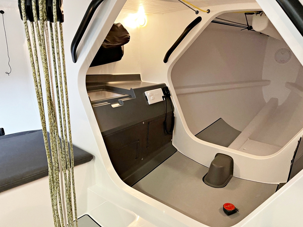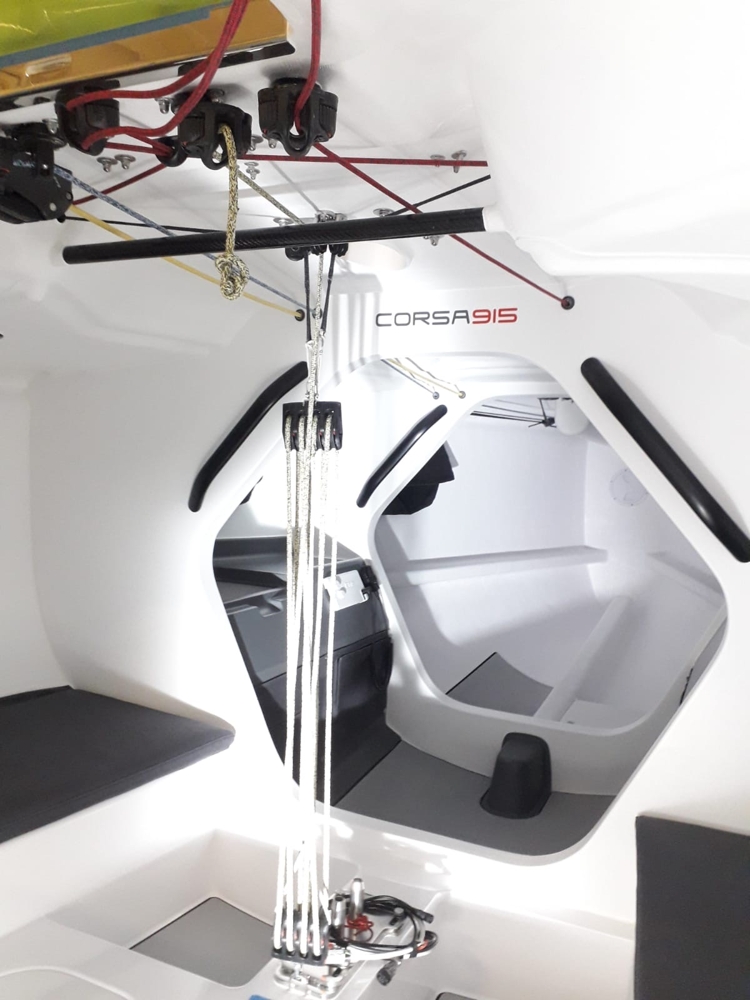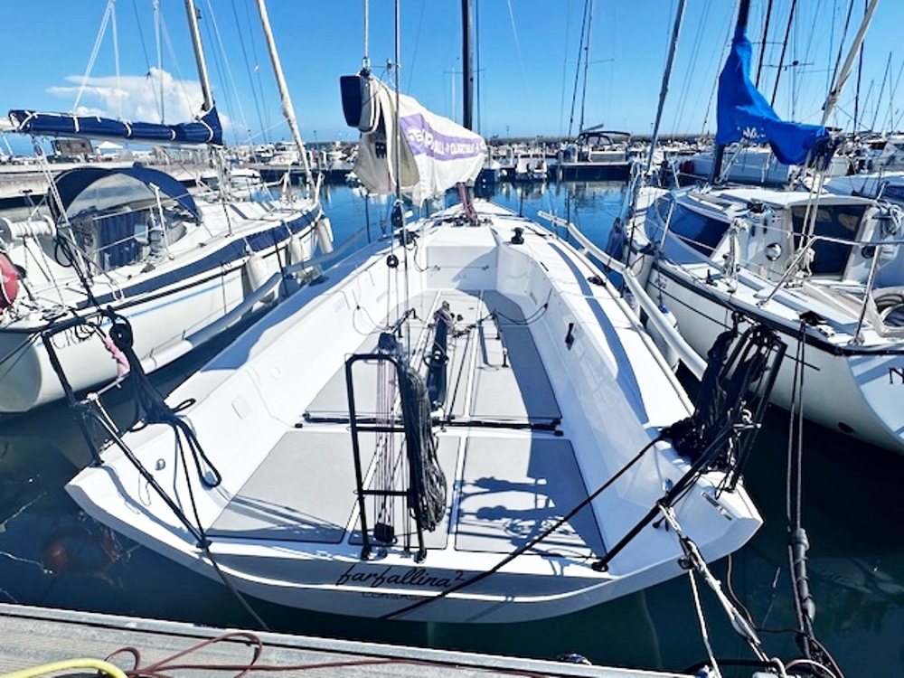 4 Liegeplätze. Manuelle Toilette. Pauger Karbonmast mit Doppelzylindermastbuchse. Pauger Carbon Boom. Pauger Carbon Vang. Rodrigging. Hochfeste Kaskadenrückhaltevorrichtung. Pauger Carbon bowsprit. Gennaker rigging. Smart Tune Blattkontrolle mit Wi-Fi-Transponder zum Anzeigen von Daten auf B&G-Instrumenten, Smartphones oder Tablets. Cunningham System zur Steuerung der Jib-Luff-Spannung. Karbon-Kupfer. B&G Hercules 5000 Instrumentierung mit zwei Mastrepetitoren. Im Cockpit: Vulkan 7R für Charts und andere Renndaten. B&G VHF. B&G Wi-Fi Router. Batterien: 55Ah AGM für Instrumente, Navigationsleuchten und Services. Batterien: 55Ah AGM für Motor. Elektrische Bilgepumpe. Elektrische Pumpe zum Trocknen des Motorraums. Lopolight Navigationslicht (niedriger Verbrauch). Haupt-Elektro-Panel über Bluetooth von einem iPhone gesteuert. Aufbewahrungstaschen im Cockpit und innen. Innenkissen. Zugmesser. Doppeldeckel zum Schließen des Bootseingangs bei schlechtem Wetter (hart und weich). Toilettenhalter. Verschiedene Ausrüstung für Langstreckenrennen. Raptor Cockpitkissen. Ubi Bürgermeisterdeckbeschläge. PBO Forestay mit Aero Tuff Luff.