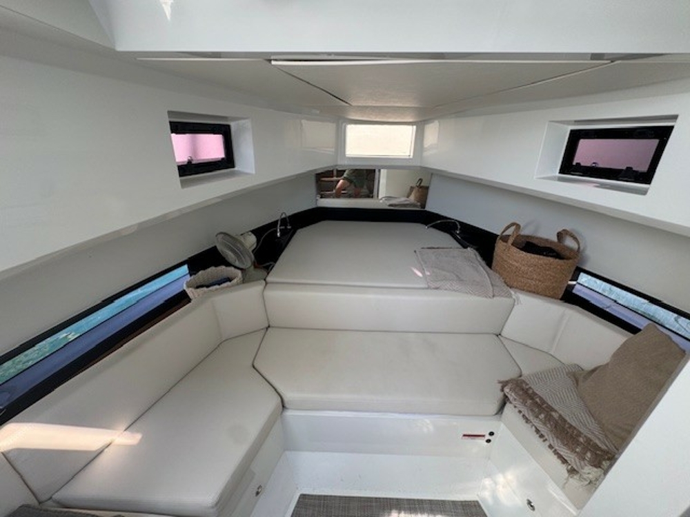 Inside, the D36 surprises its versatility. It offers two cabins: one main with a double bed in the front and one in aft with a “U” layout that can accommodate up to three people. It also has a full bathroom with separate electric WC, a detail that provides privacy and comfort in longer stays. The natural light enters into raudles thanks to the side windows in the helmet, creating a cozy and elegant atmosphere.