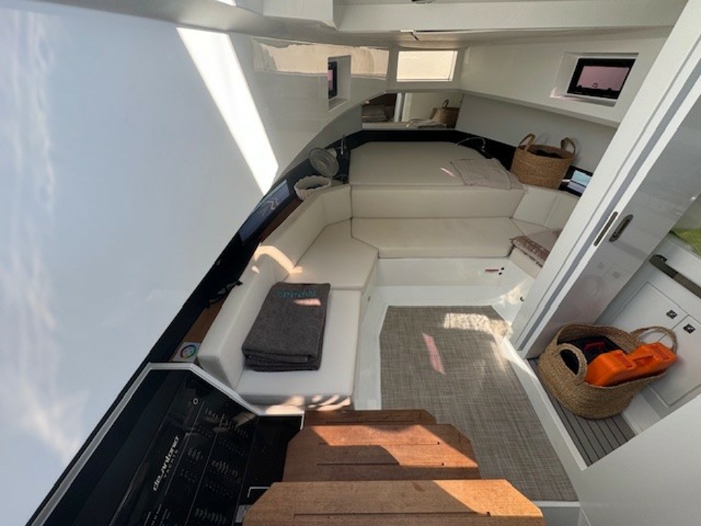 With a length of more than 11 meters and a 3,40 meters sleeve, the D36 offers a surprisingly wide and well distributed space. Its walkaround design allows fluid circulation across the deck, ensuring safety and comfort in both navigation and anchoring. In proa we find a generous solarium, perfect to relax under the sun, while in popa stands out a seating area with convertible table and direct access to the wide bathing platform, ideal to enjoy the sea with friends or family.