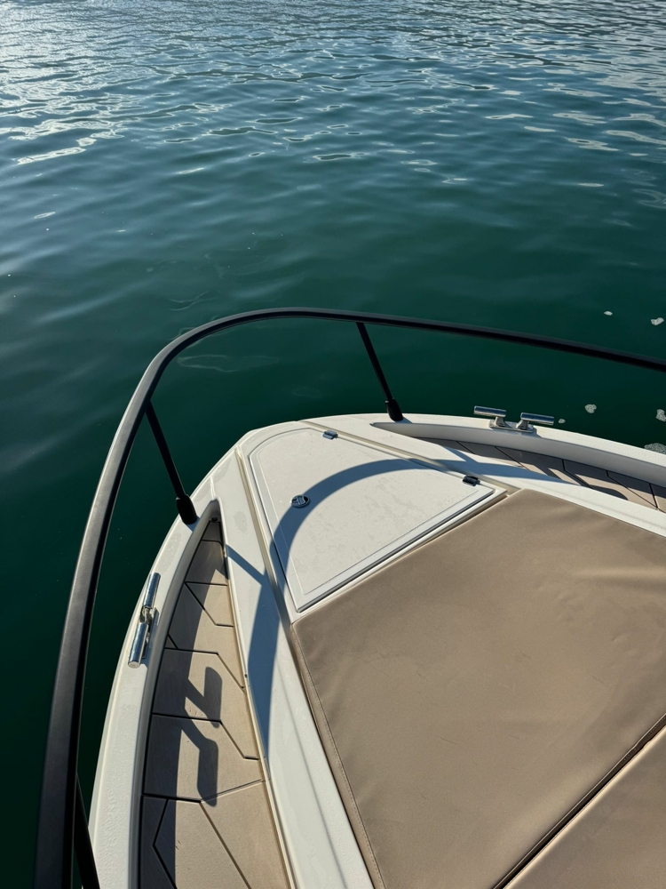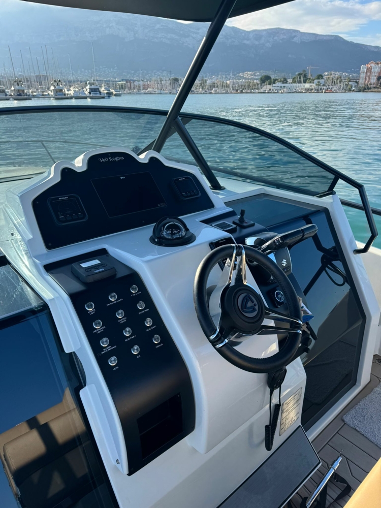 Despite its relatively compact size, Regina 340 is designed to maximize space. The interior has a double bed in aft, full bathroom, and an extra cabin on the side of a bow. The interior design is elegant and functional, with high quality finishes, wood and soft upholstery.