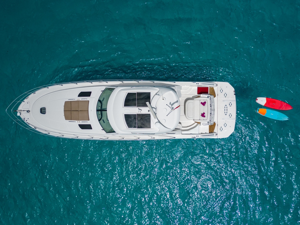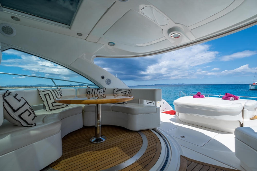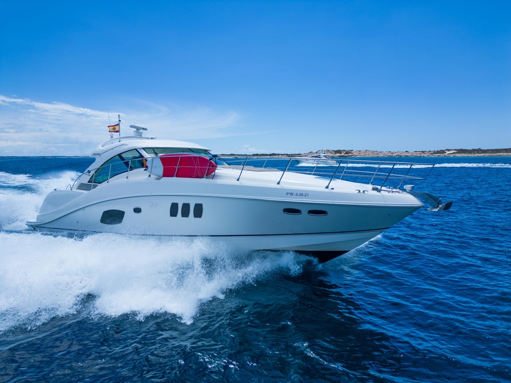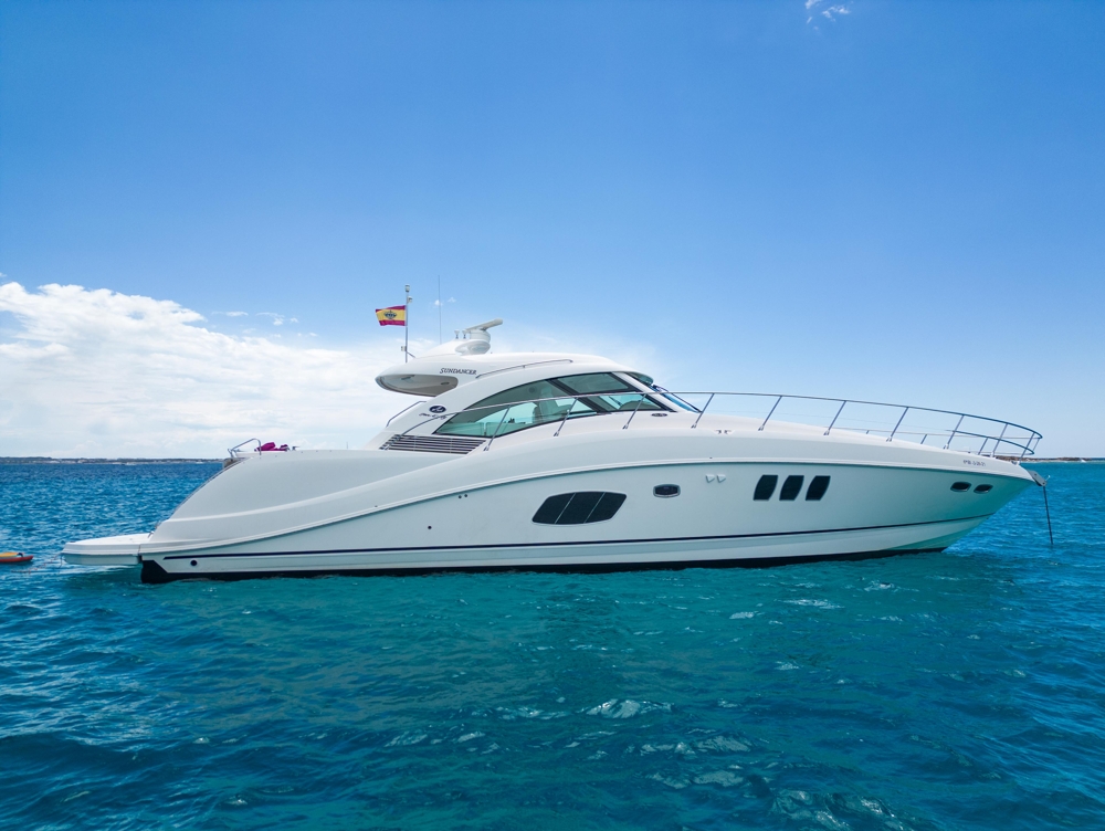 The Sea Ray 55 Sundancer “IL CONSIGLIERE” combines elegance, performance and comfort in a timeless American design yacht. Built in 2008 by Sea Ray, this 16,76-metre express cruise offers a powerful and stable navigation thanks to its 900 hp MAN V8 diesel engines, reaching a cruise speed of 20–24 knots and a maximum of up to 32 knots. It is designed for both private and luxury charter use, it stands out for its spacious outdoor areas: sun terrace for bow and stern, bathtub with dining table, hydraulic bath platform, teak floor, electric solar roof and a spectacular “sunroom” upper room with 360° panoramic view. It is tied in Marina Botafoch, with the mooring included in the price. Inside we find finishes in high gloss cherry wood and a very functional distribution: Equipped with air conditioning, satellite TV, Bluetooth sound system, fully equipped kitchen, washing machine/dryer and outdoor grill. “IL CONSIGLIERE” is an excellent market opportunity, ideal as a family yacht in the Mediterranean or as a boat with great charter potential in Ibiza.