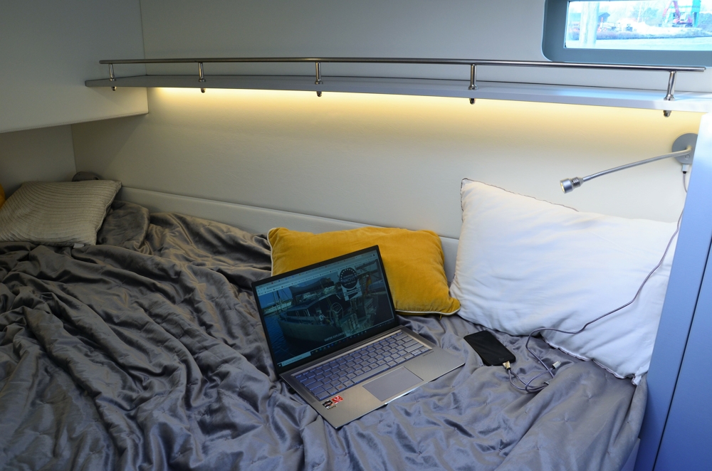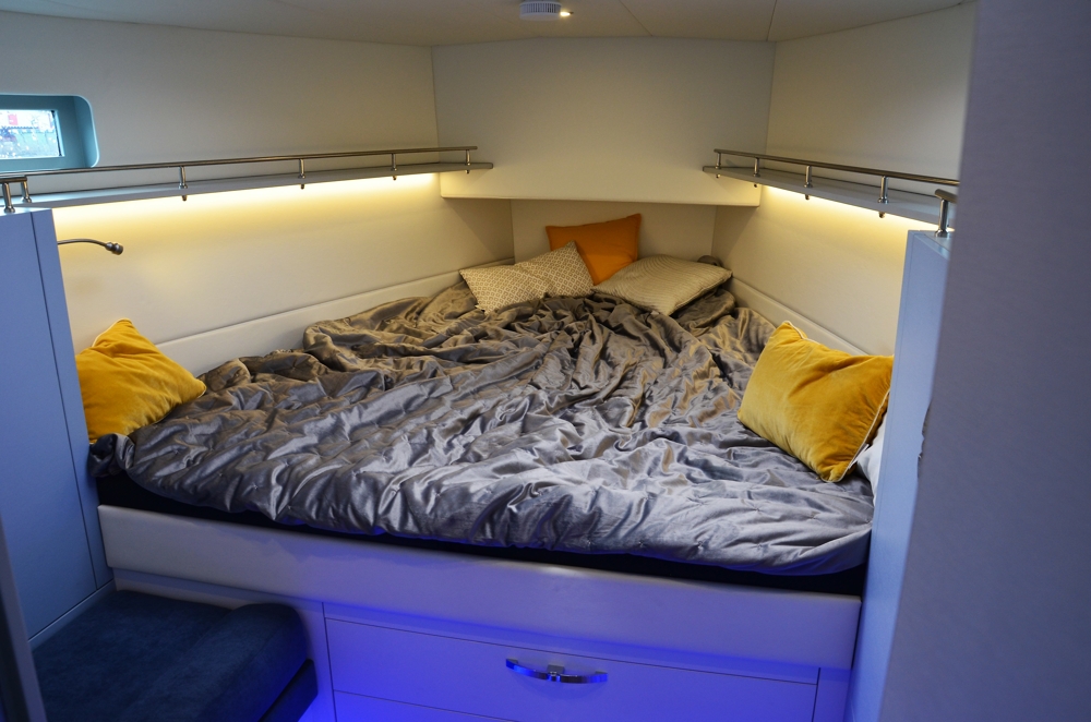 The hybrid drive of the Viator Explorer 42 DS is another highlight. For up to 2 hours, you can use the completely silent and vibration-free E-drive. The 2x 10KW twin drive offers excellent maneuverability in port maneuvers and with the remote control the boat can be controlled from any position on deck. One way to put on or lay off becomes much more stress-free. For long motor rides, the 10KW generator can be connected, which then offers a theoretical range of 1,000 nautical miles with the 500 liter diesel tank. With the hybrid drive, the Viator Explorer 42 DS is already prepared for future regulations and possibly diesel bans.